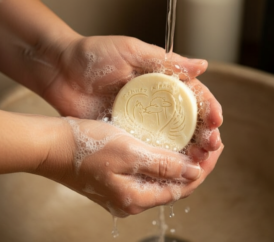 Handgesiedete Alpakakeratinseife ohne Farb- und Geruchsstoffe mit einer Überfettung von 5% für die tägliche Pflege von Haut und Haaren