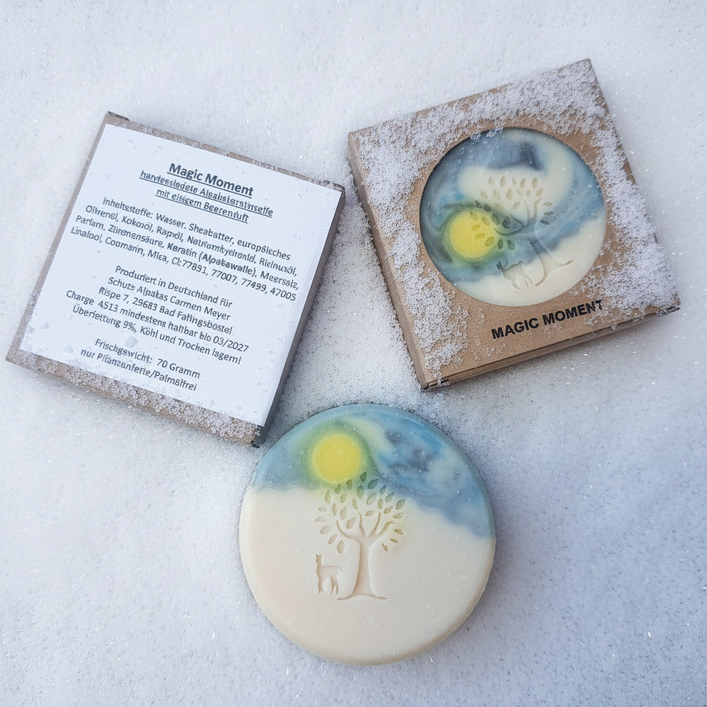 Diese handwerklich gefertigte Seife kombiniert die pflegenden Eigenschaften von Alpakakeratin mit einem fesselnden Beerenduft, der an winterliche Momente erinnert. Die sorgfältige Verarbeitung bewahrt die wertvollen Inhaltsstoffe und sorgt für eine sanfte, nährende Reinigung. Ein luxuriöses Pflegeerlebnis für anspruchsvolle Haut.